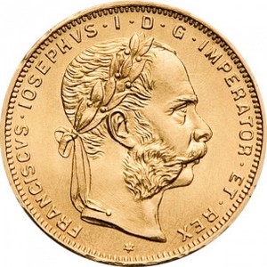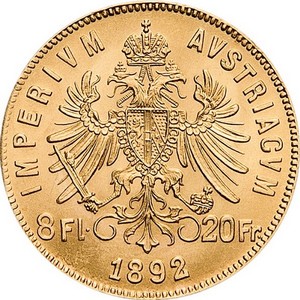 La moneta da 8 fiorini/20 franchi d’oro raffigurante Francesco Giuseppe I d’Austria è stata prodotta dalla zecca austriaca, la secolare Münze Österreich, dal 1870 al 1892. L’impero austro-ungarico infatti nel 1866 perse la guerra contro la Prussia e decise di entrare nell’Unione Monetaria Latina. Essa la prevedeva la coniazione di monete con caratteristiche identiche in tutti gli Stati d’Europa che vi aderirono. Il nome di queste monete fu “Marengo “.