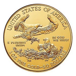 Sul retro vediamo un esemplare maschio di aquila con un ramoscello d’ulivo stretto nei suoi artigli che torna dalla sua famiglia annidata. Il disegno è stato realizzato da Miley Busiek nel 1986. In alto troviamo la scritta “United States of America”, mentre in basso “1 OZ FINE GOLD 50 DOLLARS”. A sinistra del disegno sul retro troviamo la scritta in latino “E PLURIBUS UNUM”, mentre alla destra dell’opera di Busiek c’è la frase in inglese “IN GOD WE TRUST”.
